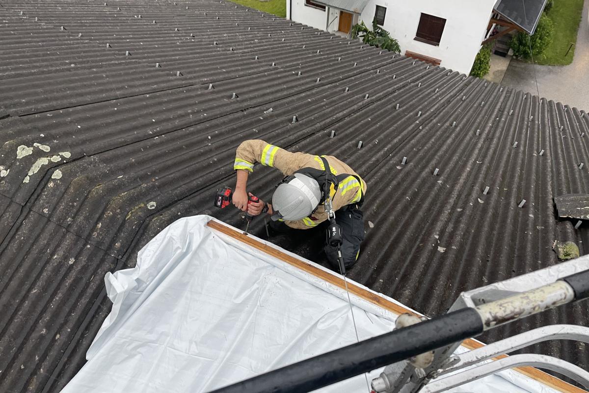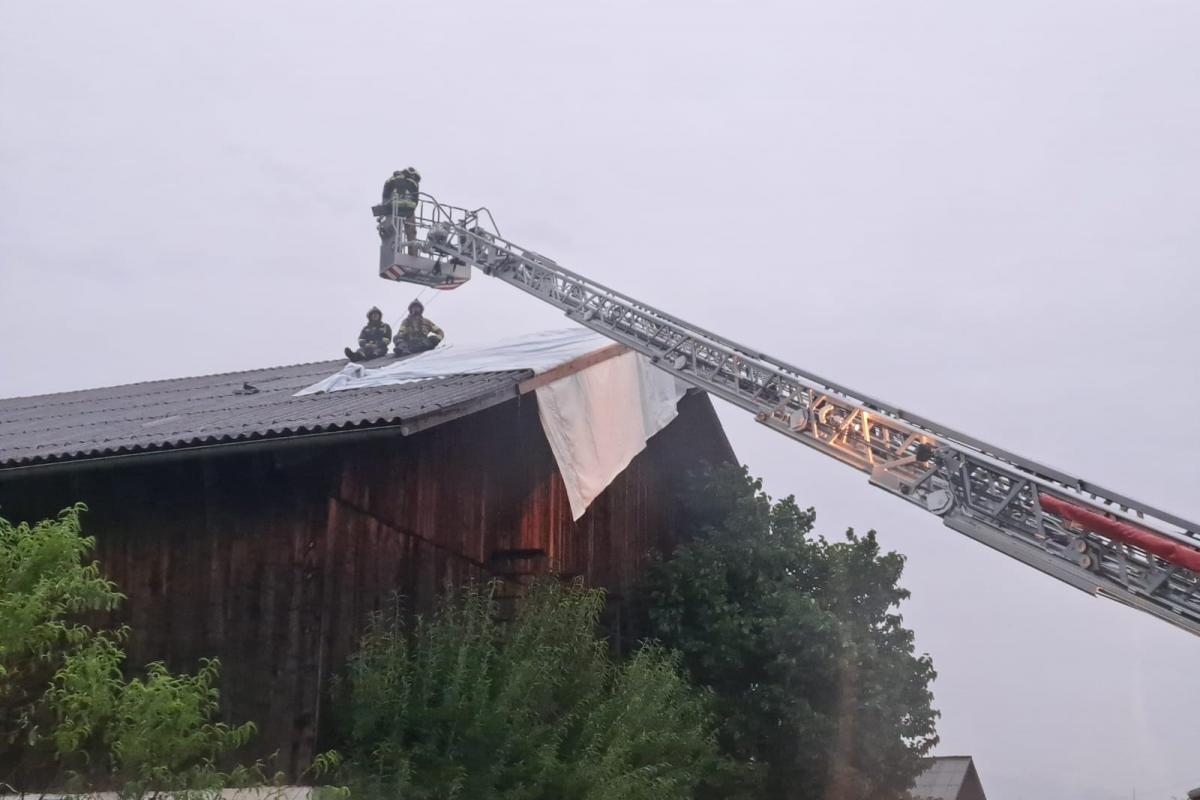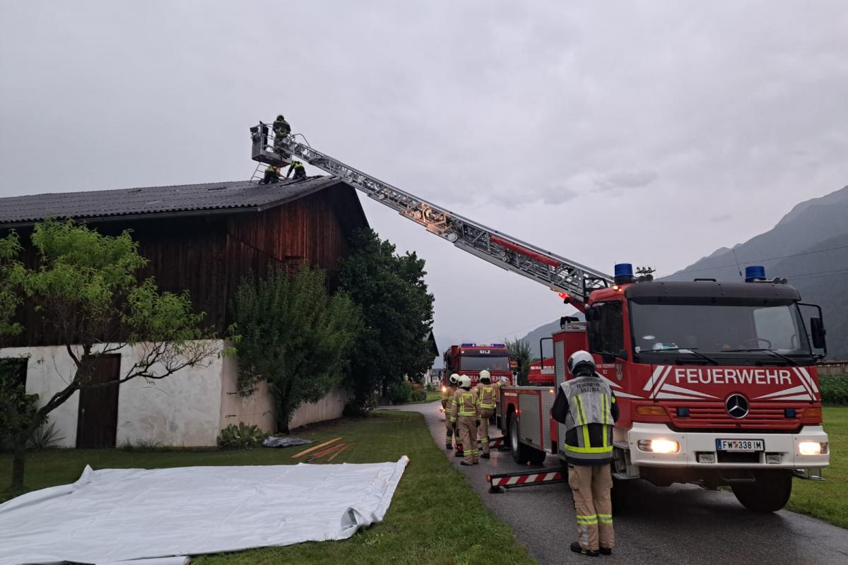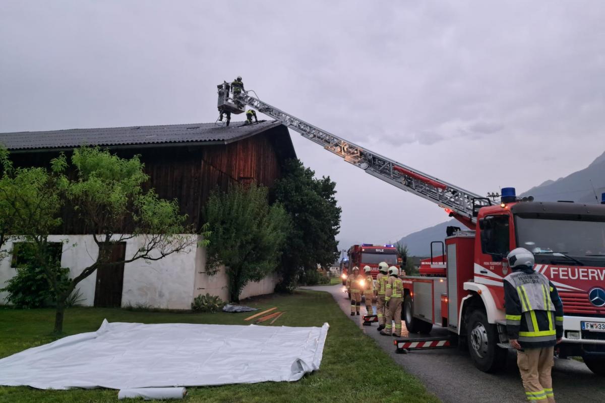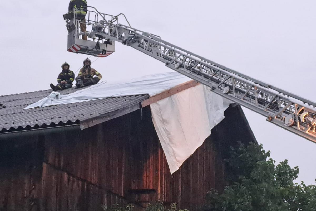 Wenige Minuten nach der Rückkehr erfolgte eine weitere Alarmierung. Nach einem kurzen, aber heftigen Unwetter mit Starkregen und kräftigen Windböen musste die Feuerwehr Silz erneut zur Unterstützung nach Stams ausrücken. Dort hatte der Wind Teile eines Daches abgedeckt. Mit der Drehleiter wurde das Dach provisorisch abgedeckt und lose Teile entfernt, um weitere Schäden zu vermeiden.