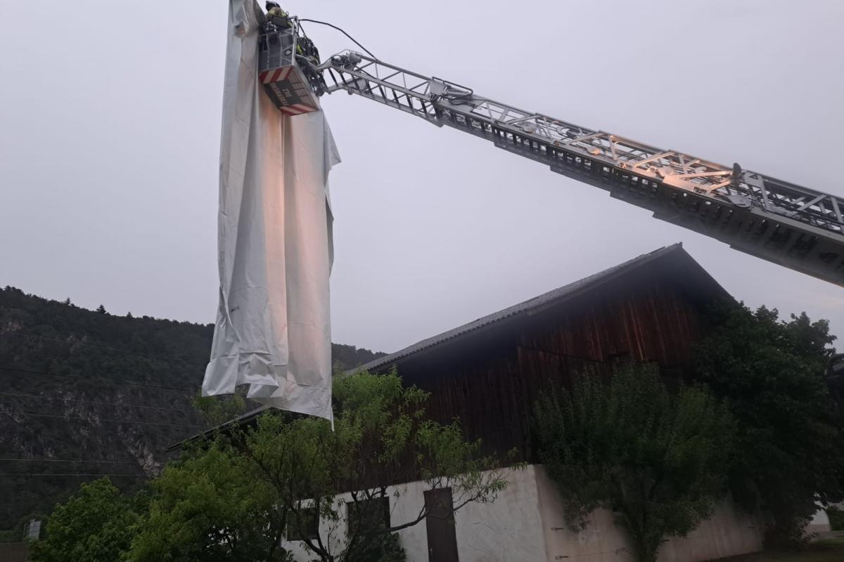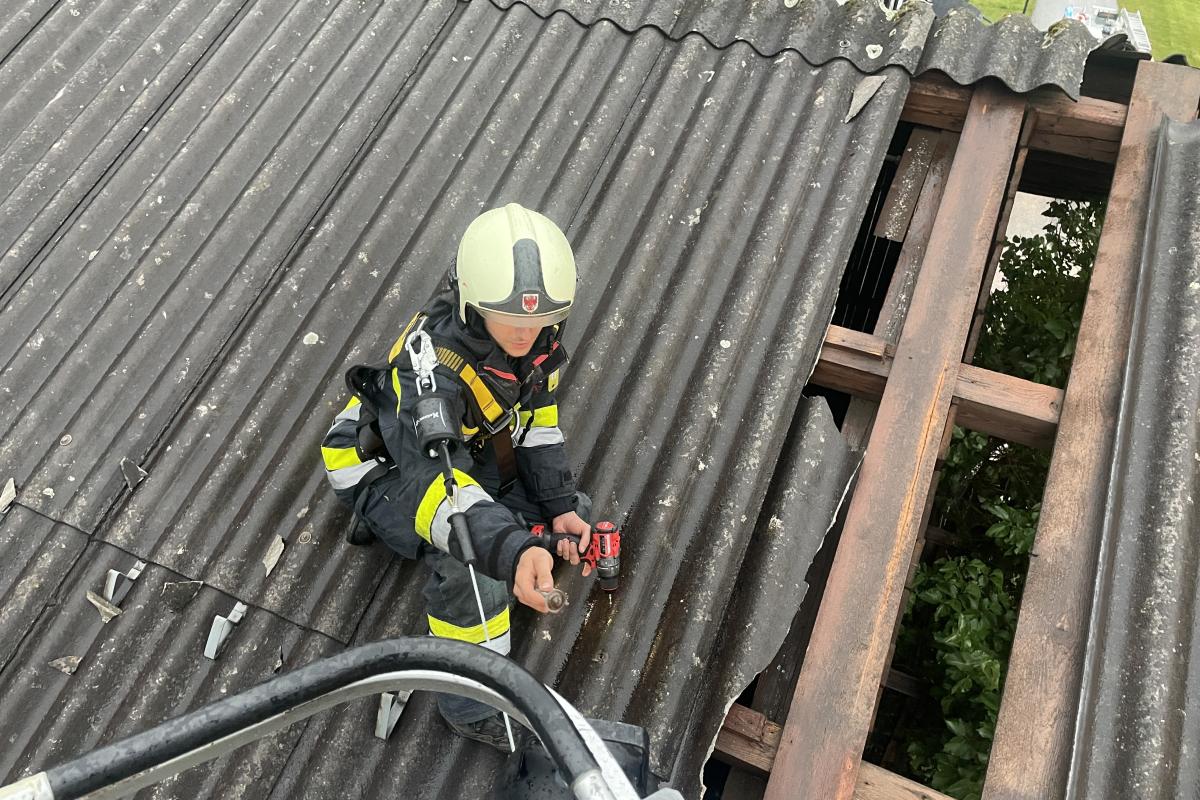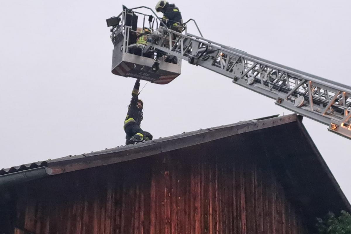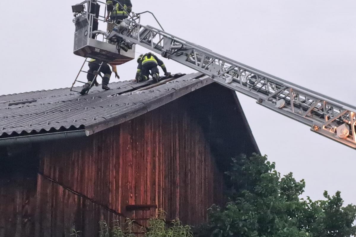 Wenige Minuten nach der Rückkehr erfolgte eine weitere Alarmierung. Nach einem kurzen, aber heftigen Unwetter mit Starkregen und kräftigen Windböen musste die Feuerwehr Silz erneut zur Unterstützung nach Stams ausrücken. Dort hatte der Wind Teile eines Daches abgedeckt. Mit der Drehleiter wurde das Dach provisorisch abgedeckt und lose Teile entfernt, um weitere Schäden zu vermeiden.
