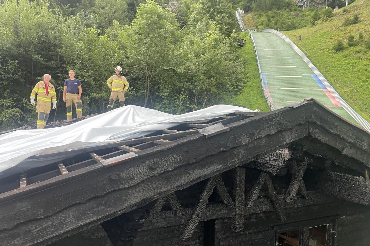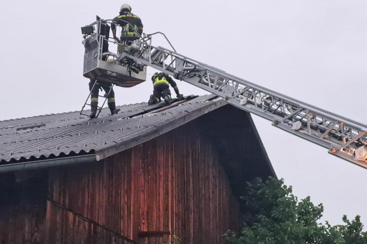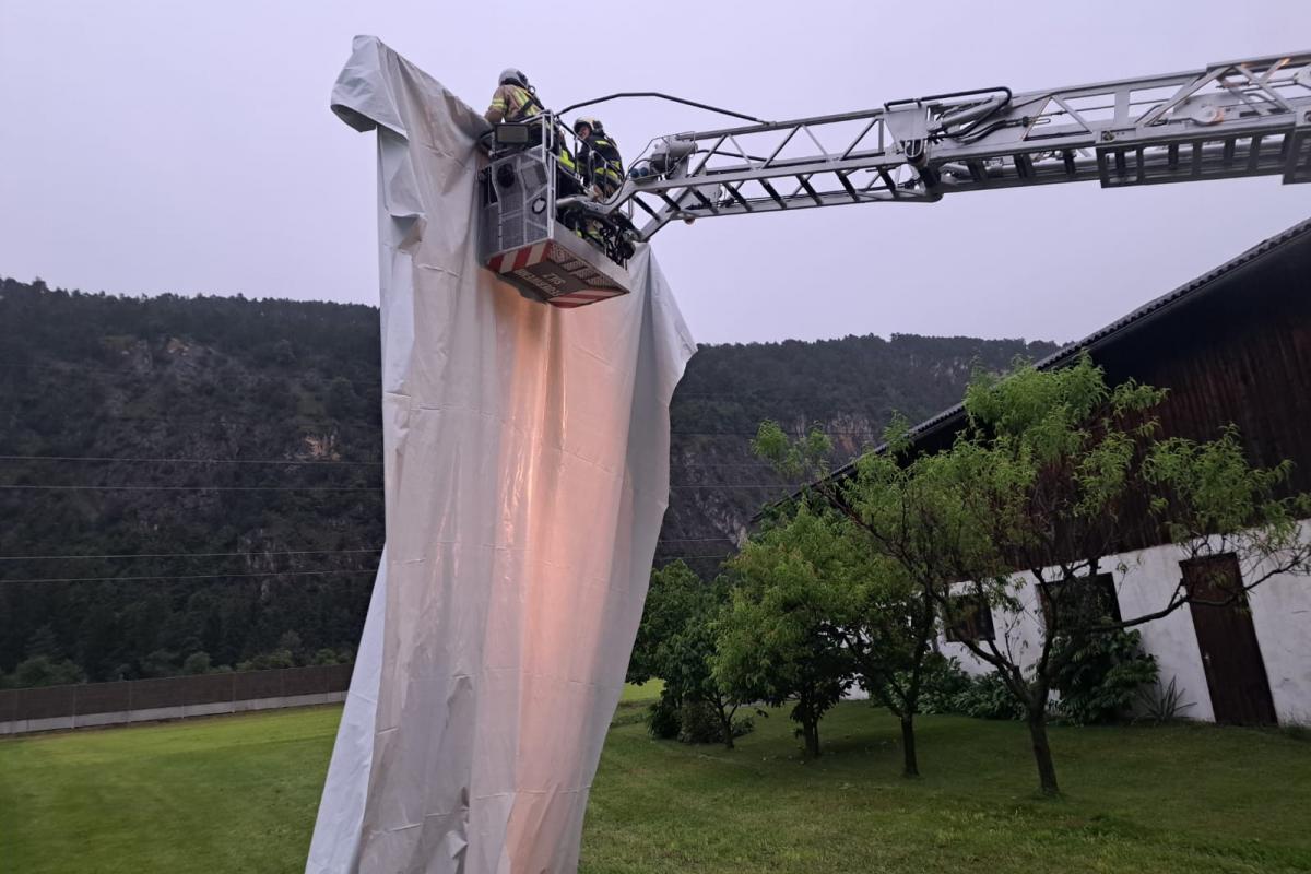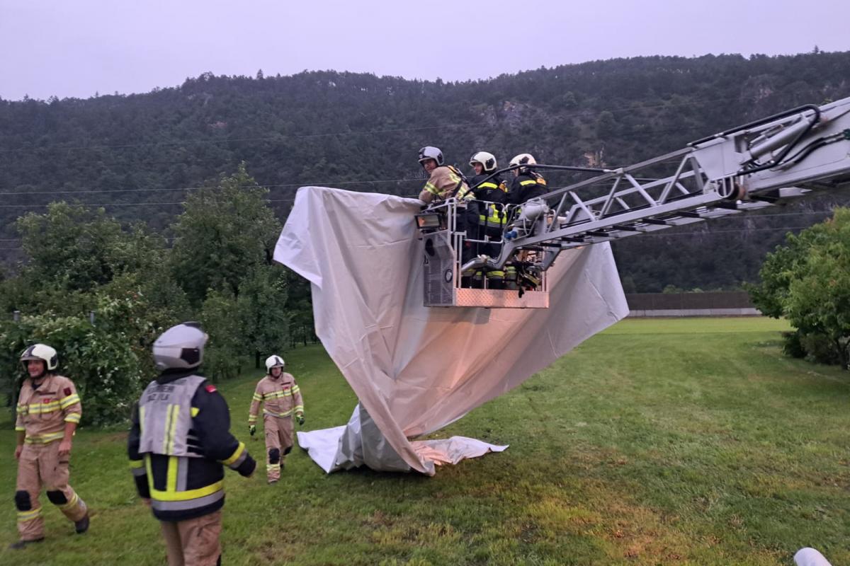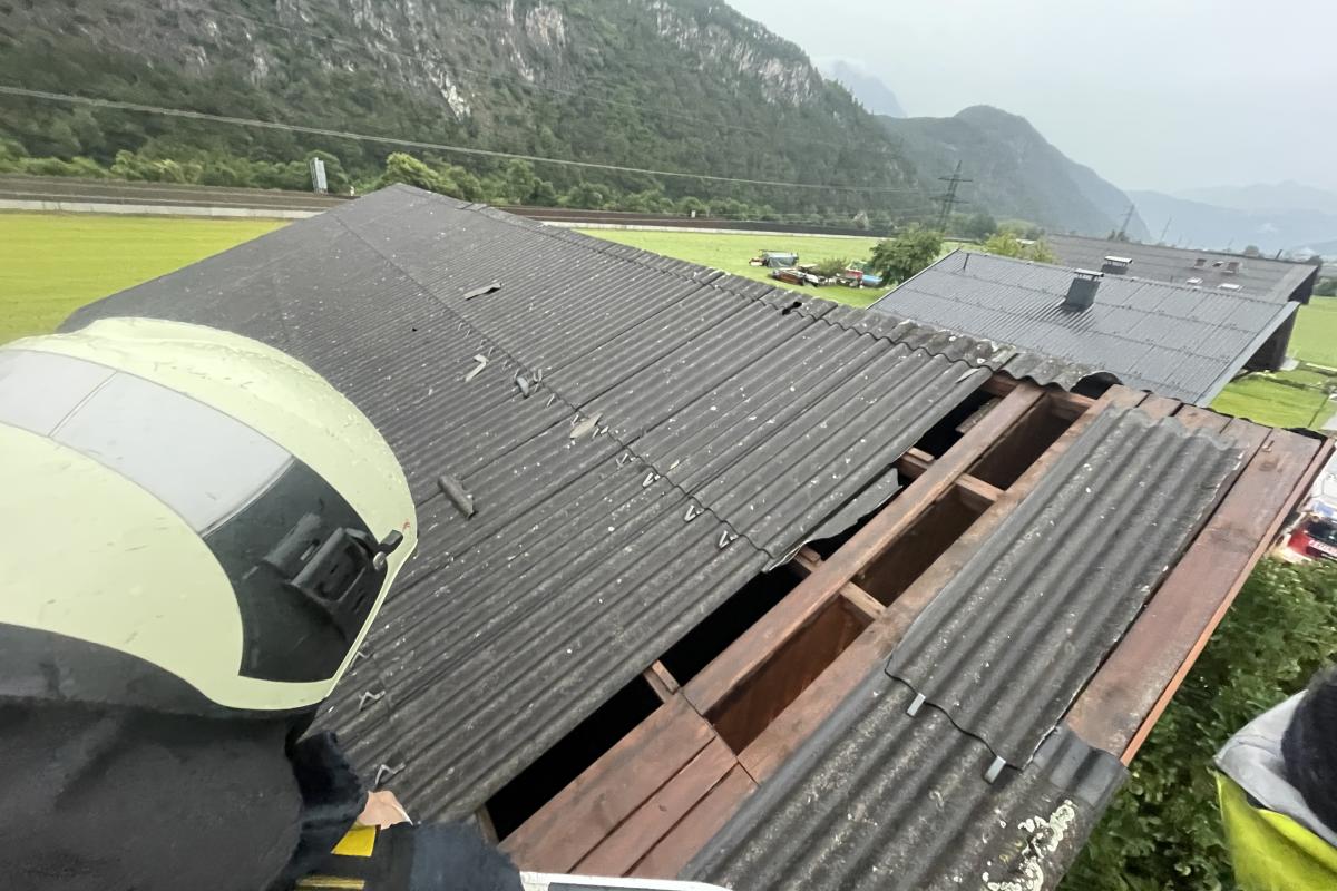 Wenige Minuten nach der Rückkehr erfolgte eine weitere Alarmierung. Nach einem kurzen, aber heftigen Unwetter mit Starkregen und kräftigen Windböen musste die Feuerwehr Silz erneut zur Unterstützung nach Stams ausrücken. Dort hatte der Wind Teile eines Daches abgedeckt. Mit der Drehleiter wurde das Dach provisorisch abgedeckt und lose Teile entfernt, um weitere Schäden zu vermeiden.
